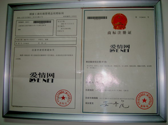 我们是国内唯一合法使用爱情网名称提供约会和婚介服务的组织机构,依照《中华人民共和国商标法》行使对爱情网服务名称的专有权利。